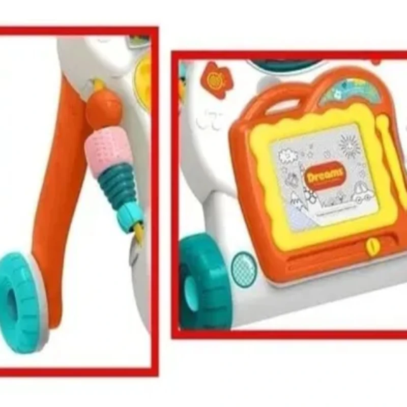 Lo que la diferencia de las andaderas comunes es su carácter interactivo. Esta versión incluye juguetes incorporados: un monófono, un teclado con luces y música, cuatro ruedas de apoyo, maracas y sonajeros que giran, todos ellos en colores vibrantes que captan la atención de los pequeños.