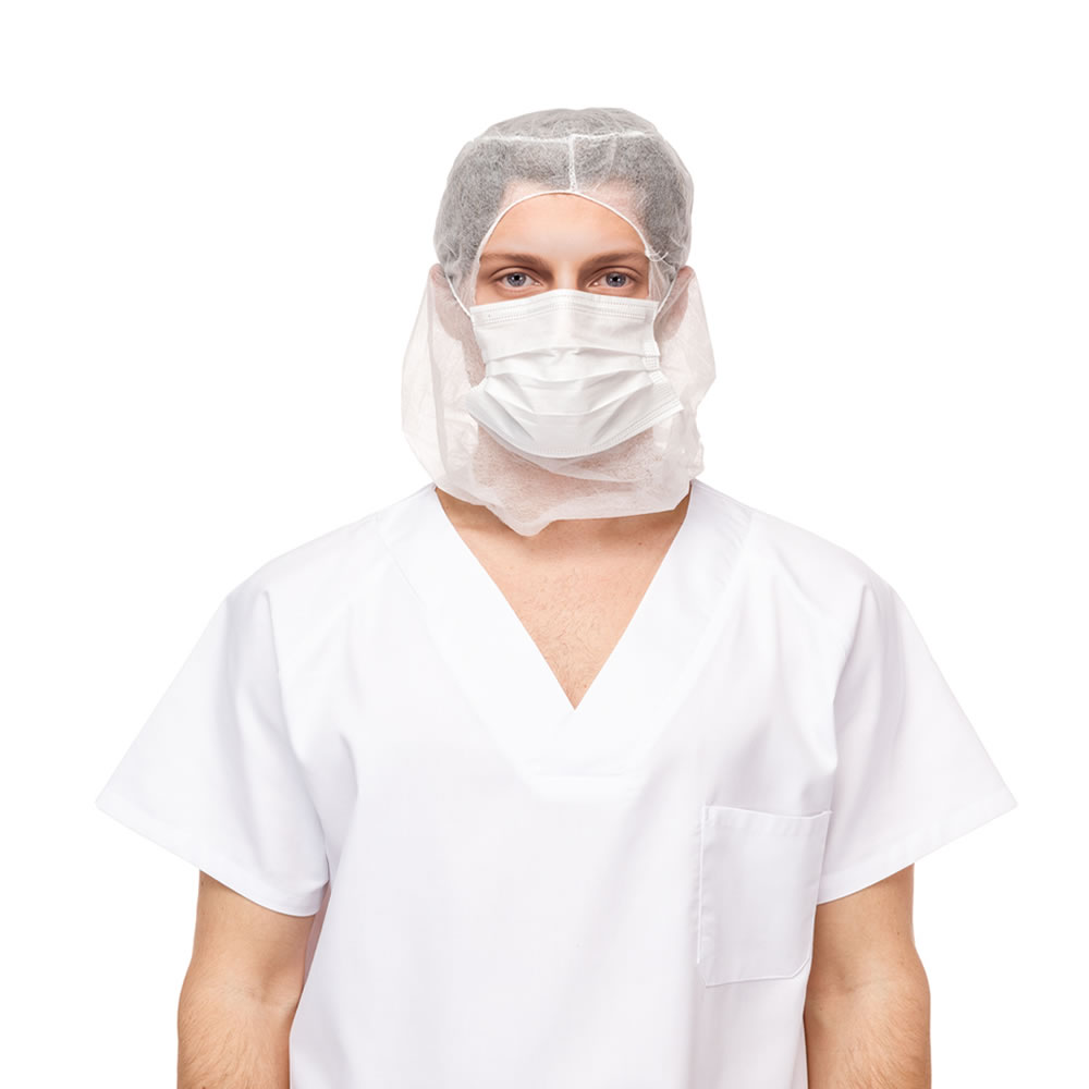 Gorro integral de polipopileno de 20 grs, ajuste con elástico en el cuello. Incorpora mascarilla de 3 capas, cosida al capuz por su parte inferior y goma ajustable en la parte superior.