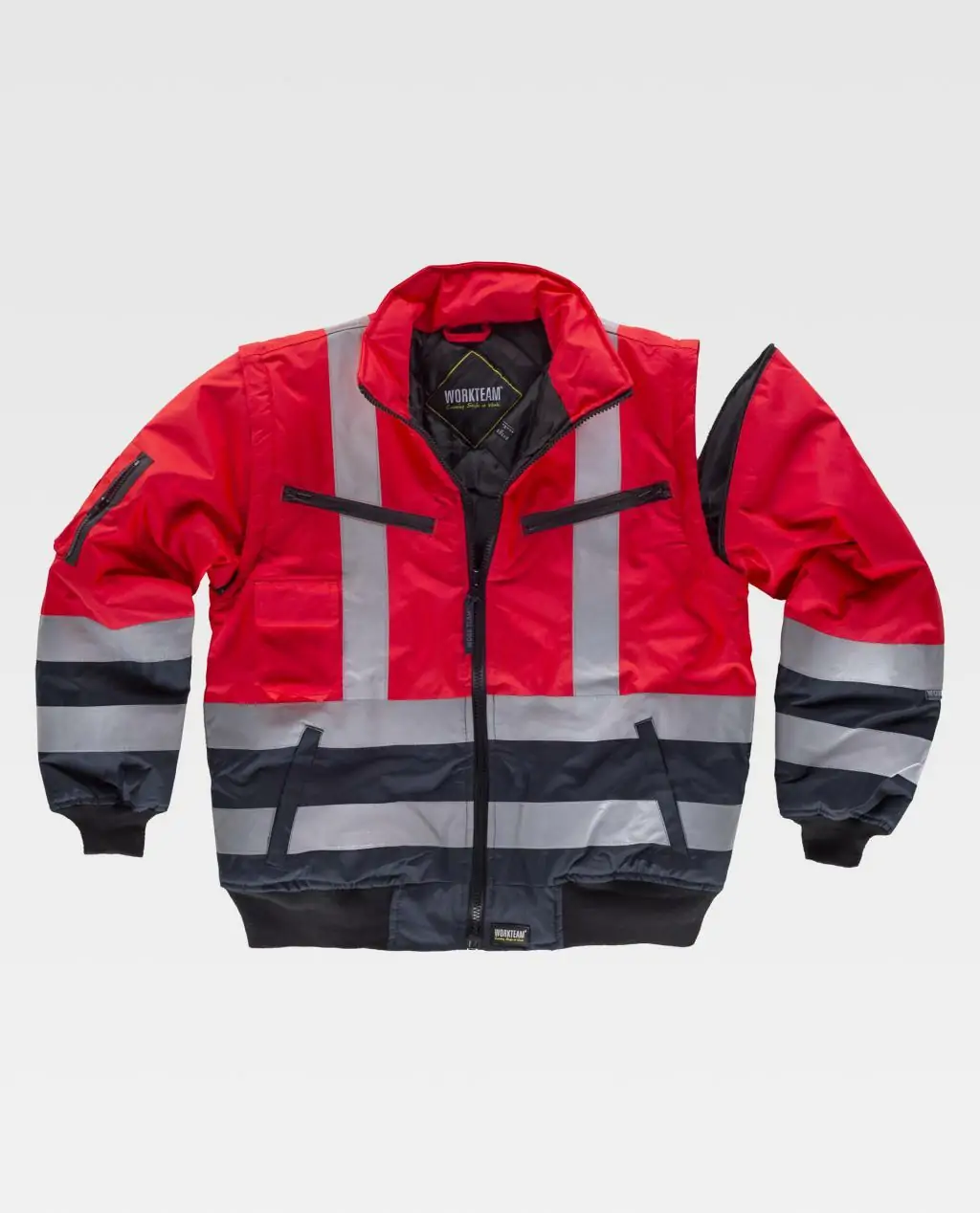 - Chaqueta piloto en alta visibilidad, con detalles reflectantes y mangas desmontables.