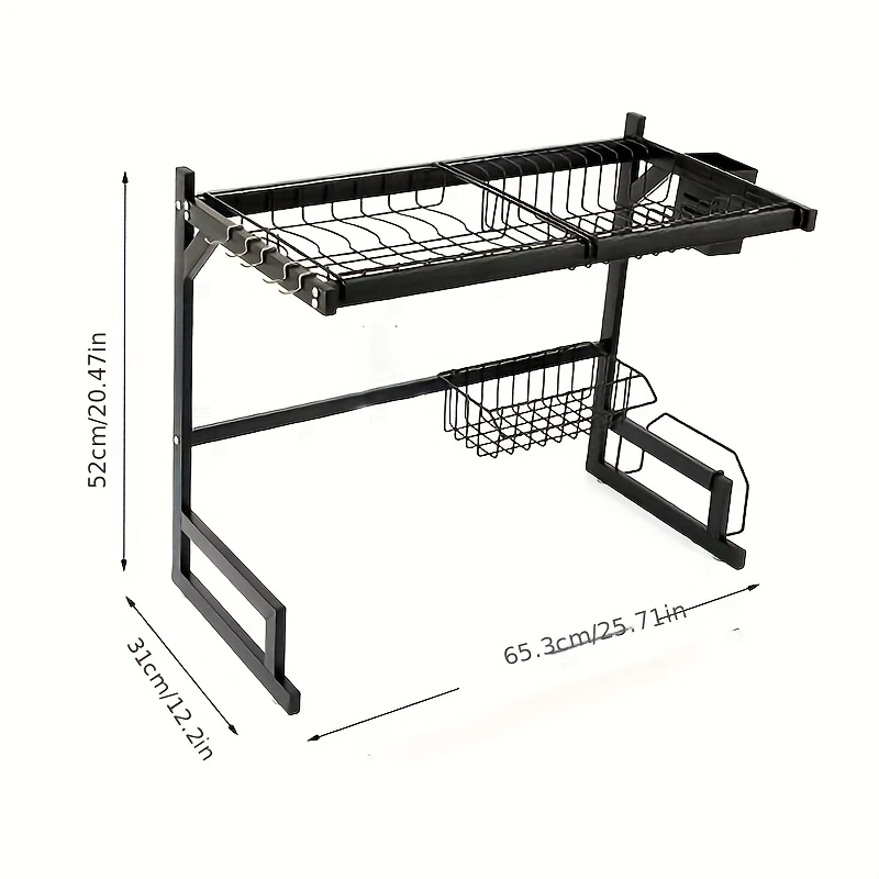 Bajo el escurridor de platos, se encuentran 6 ganchos estratégicamente ubicados para colgar cucharas, tijeras y otros utensilios, optimizando al máximo cada centímetro disponible. La estructura se mantiene estable gracias a sus dos marcos de apoyo y cuatro barras cruzadas, lo que le otorga firmeza incluso al colocar objetos pesados.