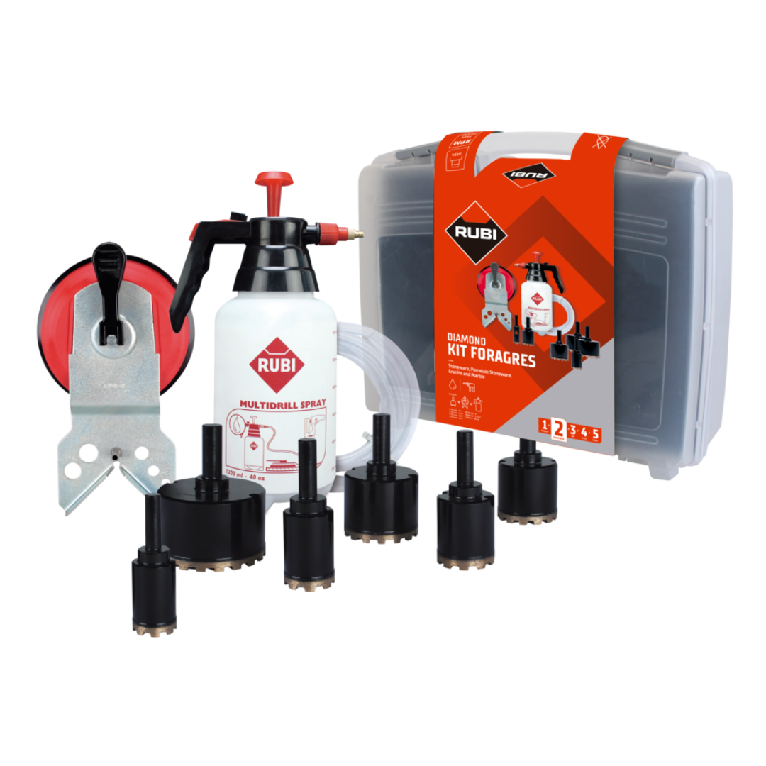 El kit FORAGRES está compuesto por: una guía MULTIDRILL, un depósito de agua de 1,2 litros de capacidad con bomba de presión manual, 2 m de manguera, 6 brocas de diamante (Ø 20, 28, 35, 43, 50, 68 mm.), y una práctica maleta estuche.
