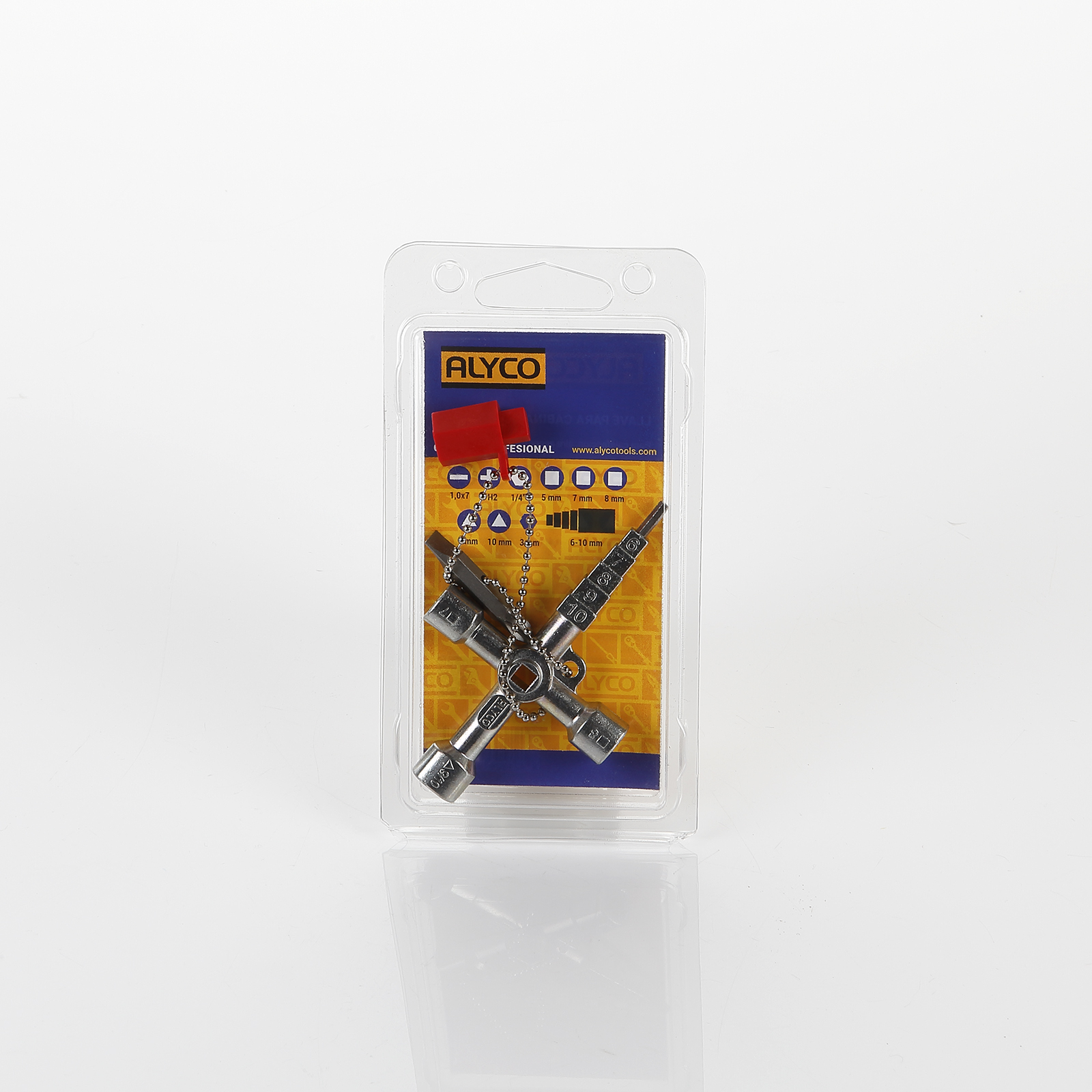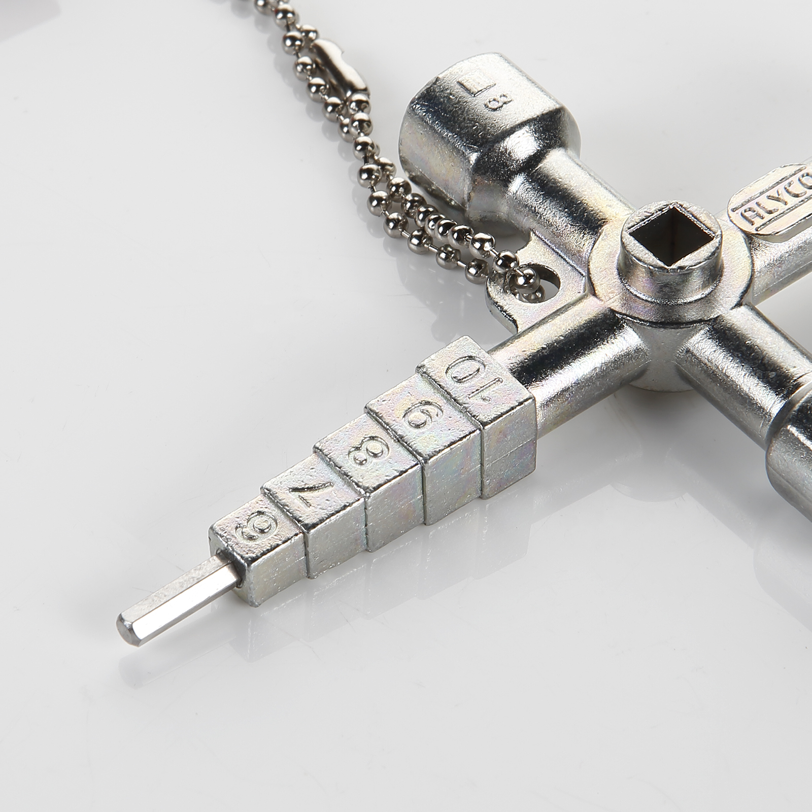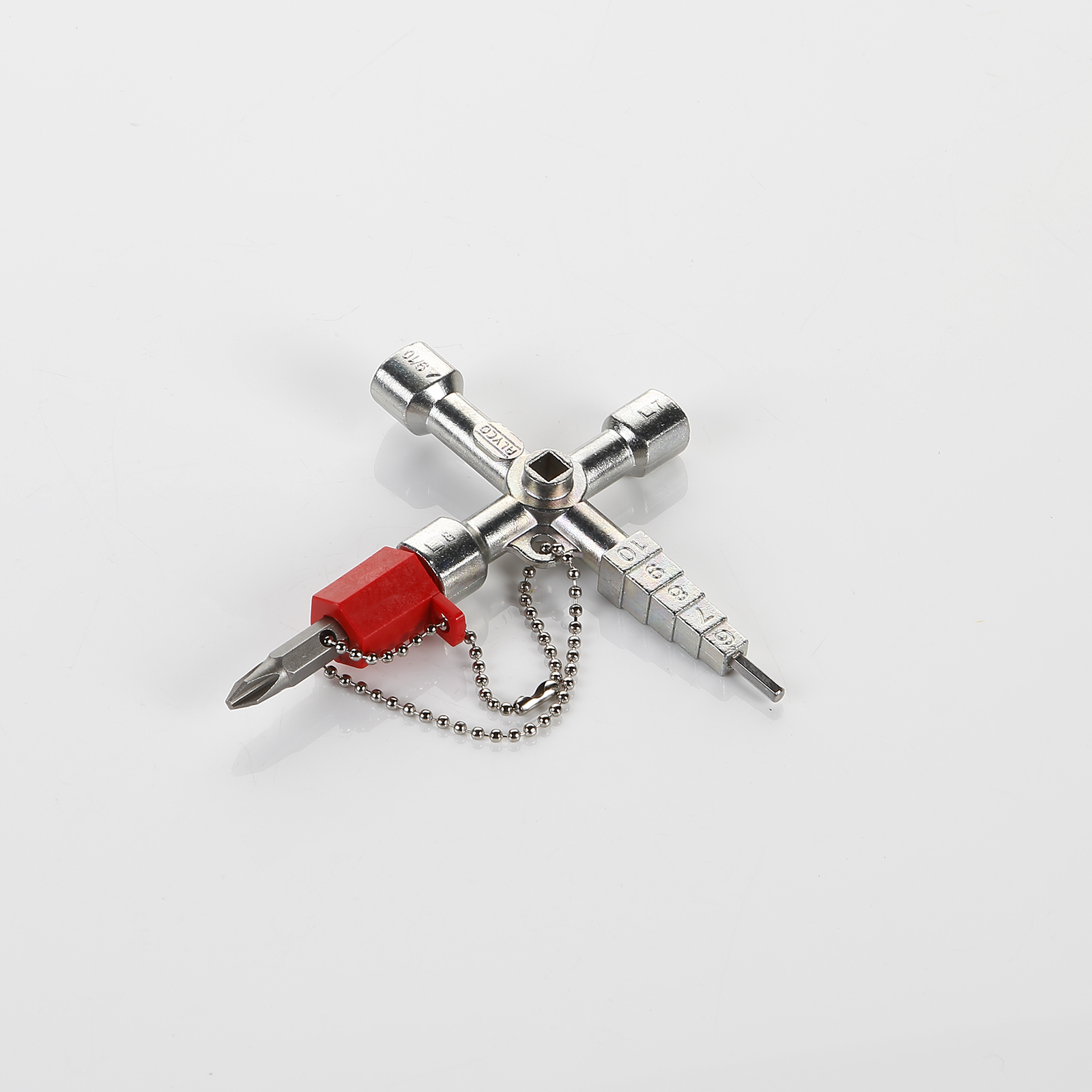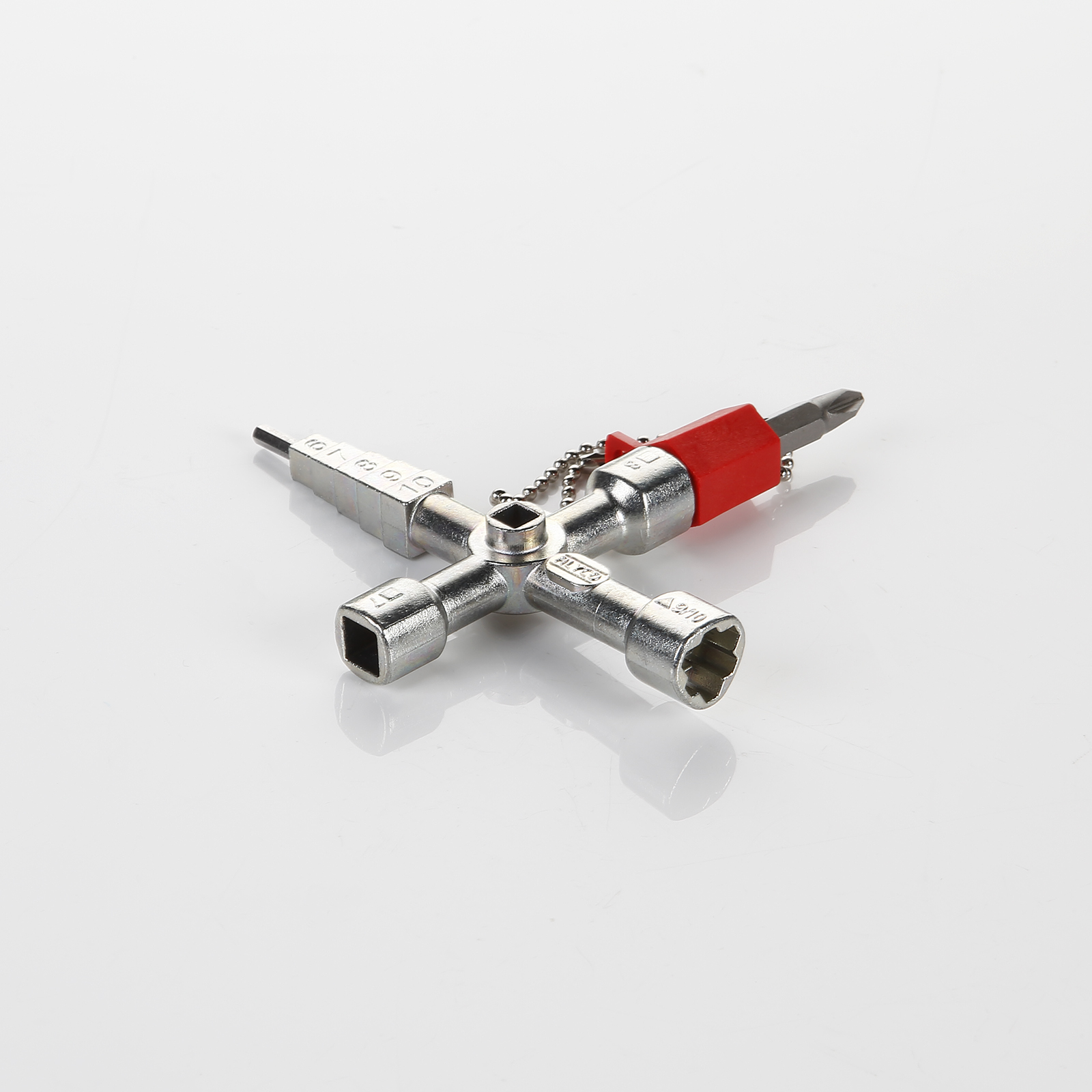 Llave multifuncional para sistemas de paso en construcción, cuadros eléctricos, calefacción, fontanería, climatización, ventilación, electrotécnica, suministro de gas y agua y sistemas de bloqueo.