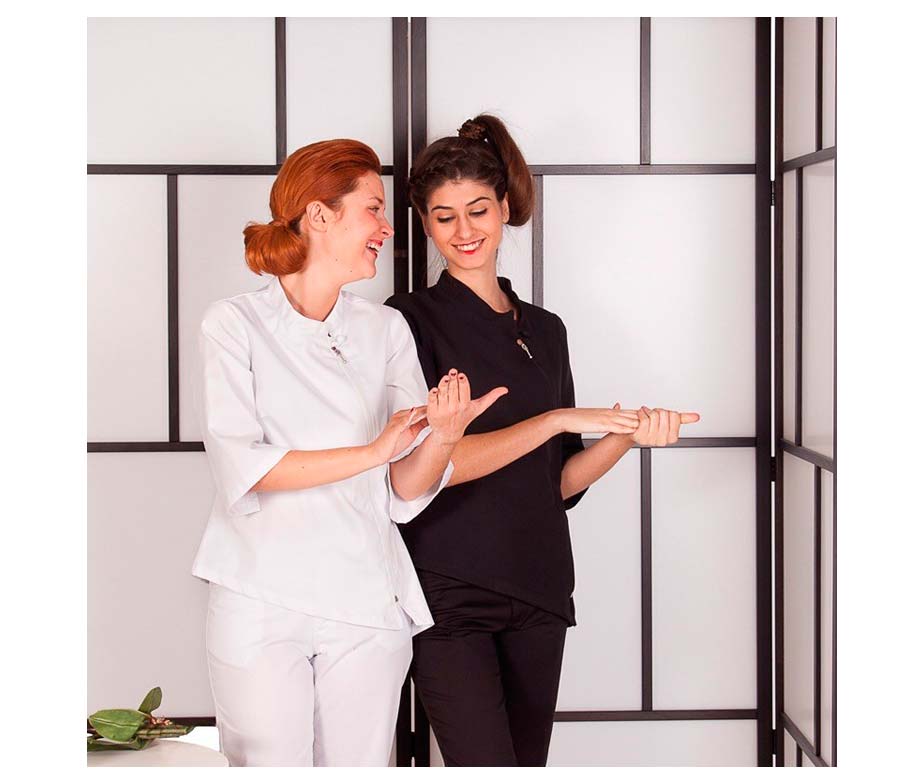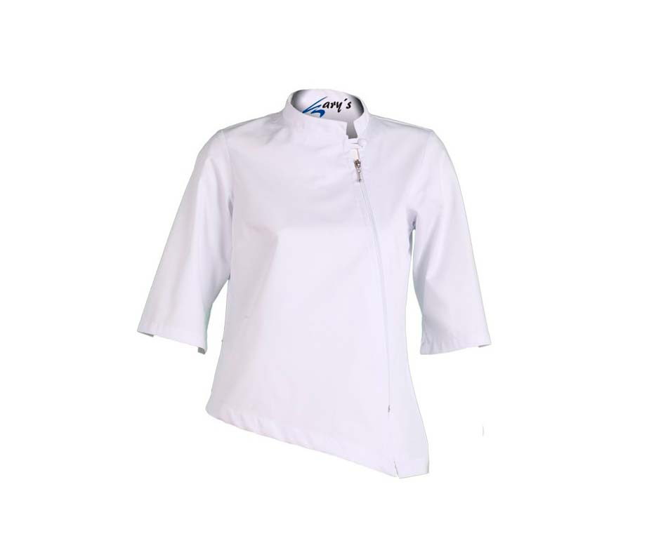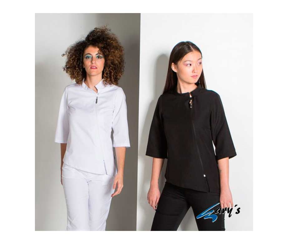 Casaca para uniformes peluquería, estética y spa elegantes. Blusa mangas 3/4 de mujer en color blanco tejido Sarga, o negro tejido 100% Poliéster Strech. Tejido muy cómodo y duradero. Gran resistencia al pilling Chaqueta esteticista o peluquera muy cómoda y con un diseño muy original. Casacas peluquería con mangas hasta el codo y cierre de cremallera en el costado. Ideal para uniformes originales de peluquerías, uniformes estética elegantes, balnearios, uniformes spa de lujo y centros sanitarios. Blusa para peluquera Garys Geisha 6238