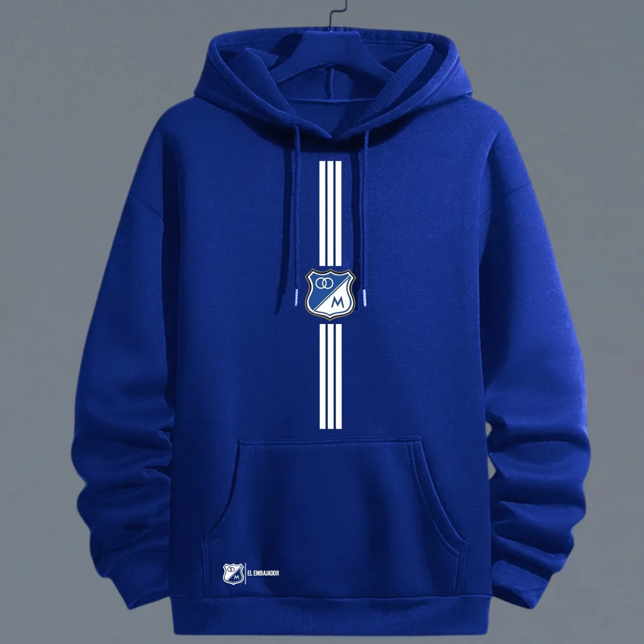 1. Hoodies de corte tradicional con detalles exclusivos y estampados del escudo de Millonarios.