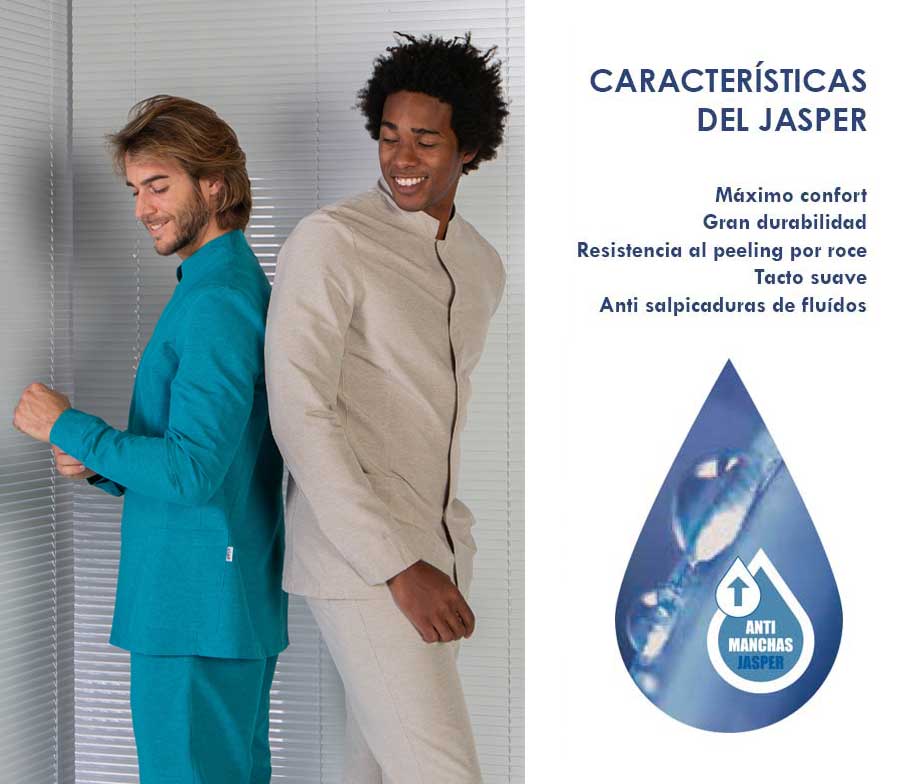 - JASPER: Tejido con propiedades antimanchas gracias a la tecnología que evita el paso de salpicaduras de agua y fluidos, tiene una alta transpirabilidad, base jaspeada, gran durabilidad, resistencia al peeling, suavidad y confort. ¡TODO VENTAJAS!