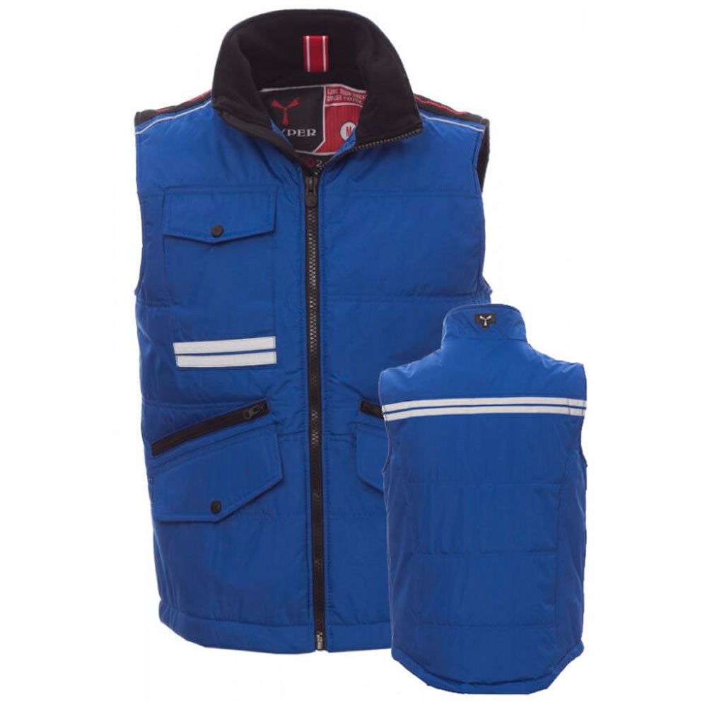 Chaleco unisex, cremallera de 8 mm de plástico con cursor de metal con tapeta y botones de plástico, parte posterior contorneada, dos bolsillos exteriores LOCK SYSTEM y dos bolsillos con cremallera, bolsillos sesgados para fácil acceso, un bolsillo a la altura del pecho para smartphone y anilla de soporte para tarjeta de identificación, bandas reflectantes en el bolsillo y en la parte trasera. Interior: acolchado, forro polar de contraste en espalda y cuello, un bolsillo, cremallera interior para facilitar la impresión y el bordado.