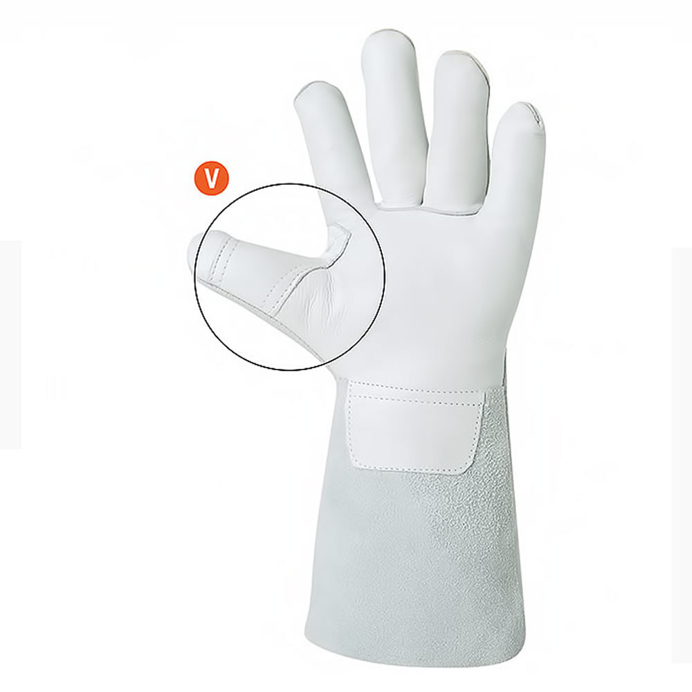 Guante palma flor vacuno dorso serraje grado A. Nudillo. Manguito largo. Comisuras protegidas. Refuerzo pulgar-índice cosido con hilo kevlar. Automoción, montajes metálicos, naval, etc…