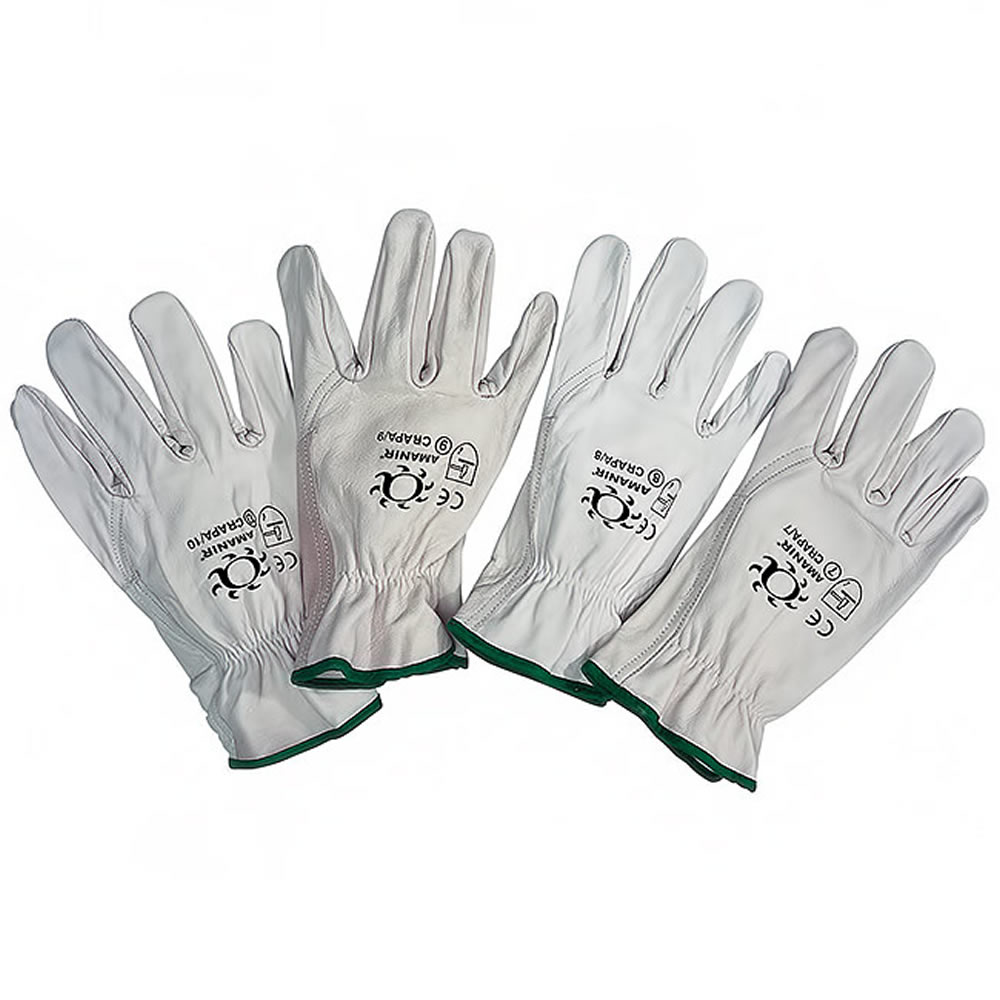Todo en flor vacuno grado A. Palma entera. Dedo índice sin costura. Protección uniforme. Montajes de estructuras, trabajos generales, servicios públicos, uso agrícola, automoción, carga y descarga.