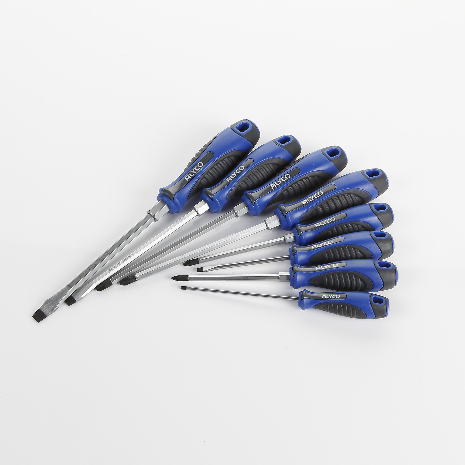 Juego de destornilladores de 8 piezas ideales para uso doméstico y profesional. Los destornilladores Alyco tienen una durabilidad y resistencia al desgaste. Tienen una varilla pasante con tope superior forjado y hexágono conductor fabricado en 2 piezas para mayor par de apriete. Las puntas son magnéticas para facilitar el acople al tornillo y poder insertar o extraer los tornillos con facilidad. Además, cuentan con un mango bimaterial trilobular de goma antideslizante que facilita el agarre, el confort y que la transmisión de la fuerza a los tornillos sea óptima.