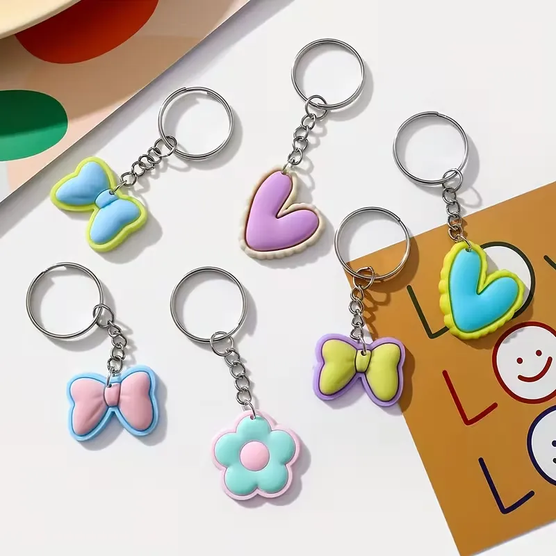 Entre las opciones más populares se encuentra un pack de 12 unidades de llaveros planos en PVC, surtidos entre flores, corazones y lazos en tonos pastel. Este conjunto se destaca por su excelente relación calidad-precio y por su versatilidad para diferentes usos, desde regalos personales hasta detalles para fiestas o eventos escolares.