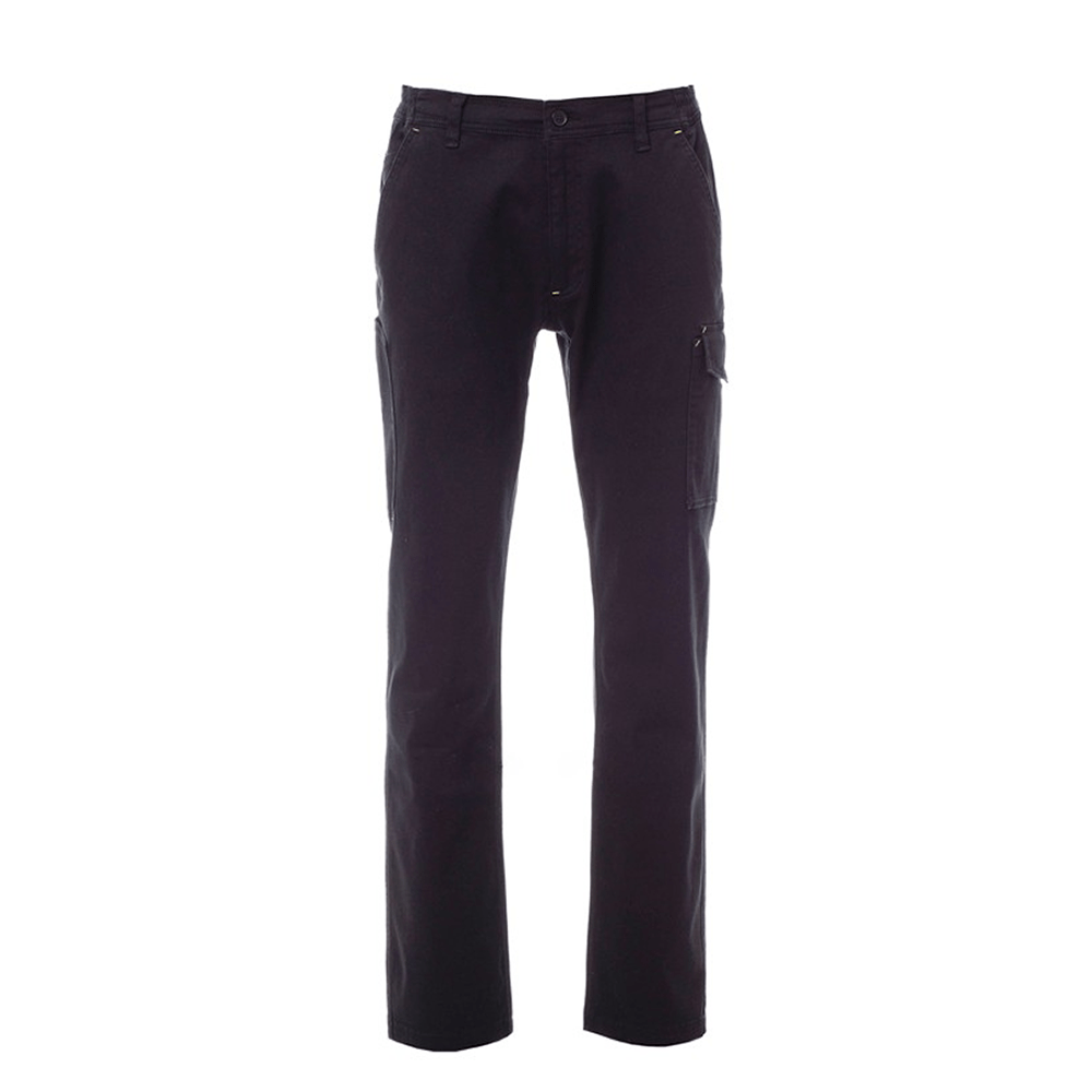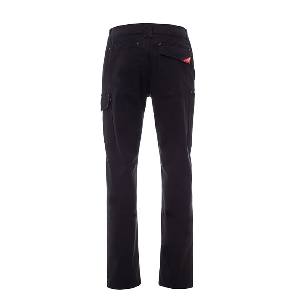 Pantalón con trabillas y elástico en la cintura, cierre con cremallera y botón. Costuras reforzadas en la entrepierna y en el interior de la pierna con triple aguja, costuras en los laterales con doble aguja, dos bolsillos delanteros de corte clásico, bolsillo pequeño portamonedas, soporte para metro lateral derecho, bolsillo lateral izquierdo con tapeta de cierre LOCK SYSTEM, dos bolsillos posteriores, uno con tapeta y velcro.