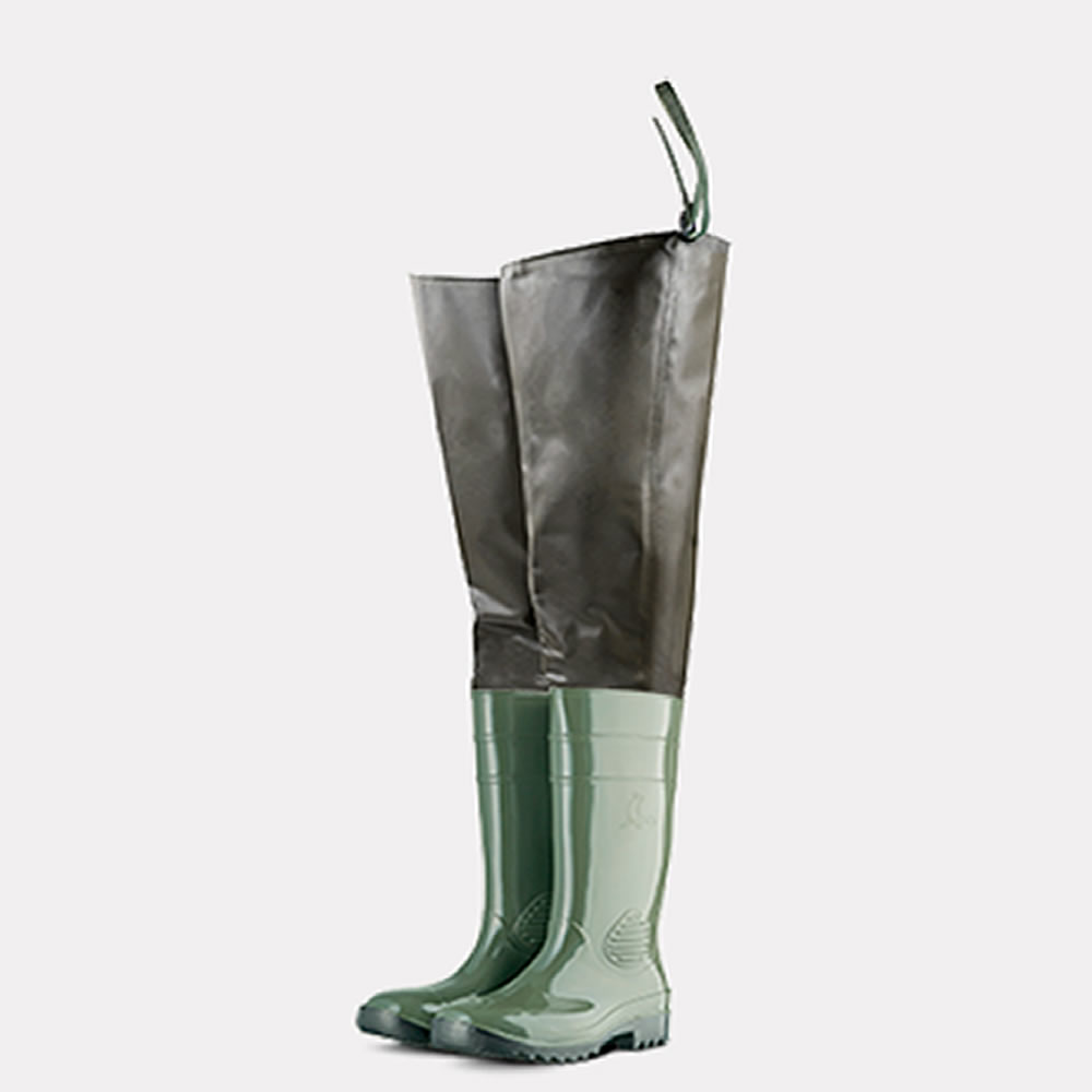El añadido se extiende unos 40 cm por encima de la bota sobrepasando la rodilla y llegando hasta la ingle. Se emplea un sistema de soldado que garantiza la estanqueidad en la junta. El PVC trilaminar resulta muy agradable al tacto y a la vez muy resistente a enganchones y punciones.